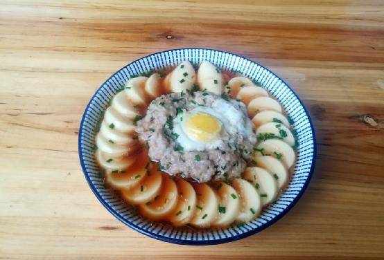 2、玉豆腐中间放肉末,中间放一个鸡蛋。