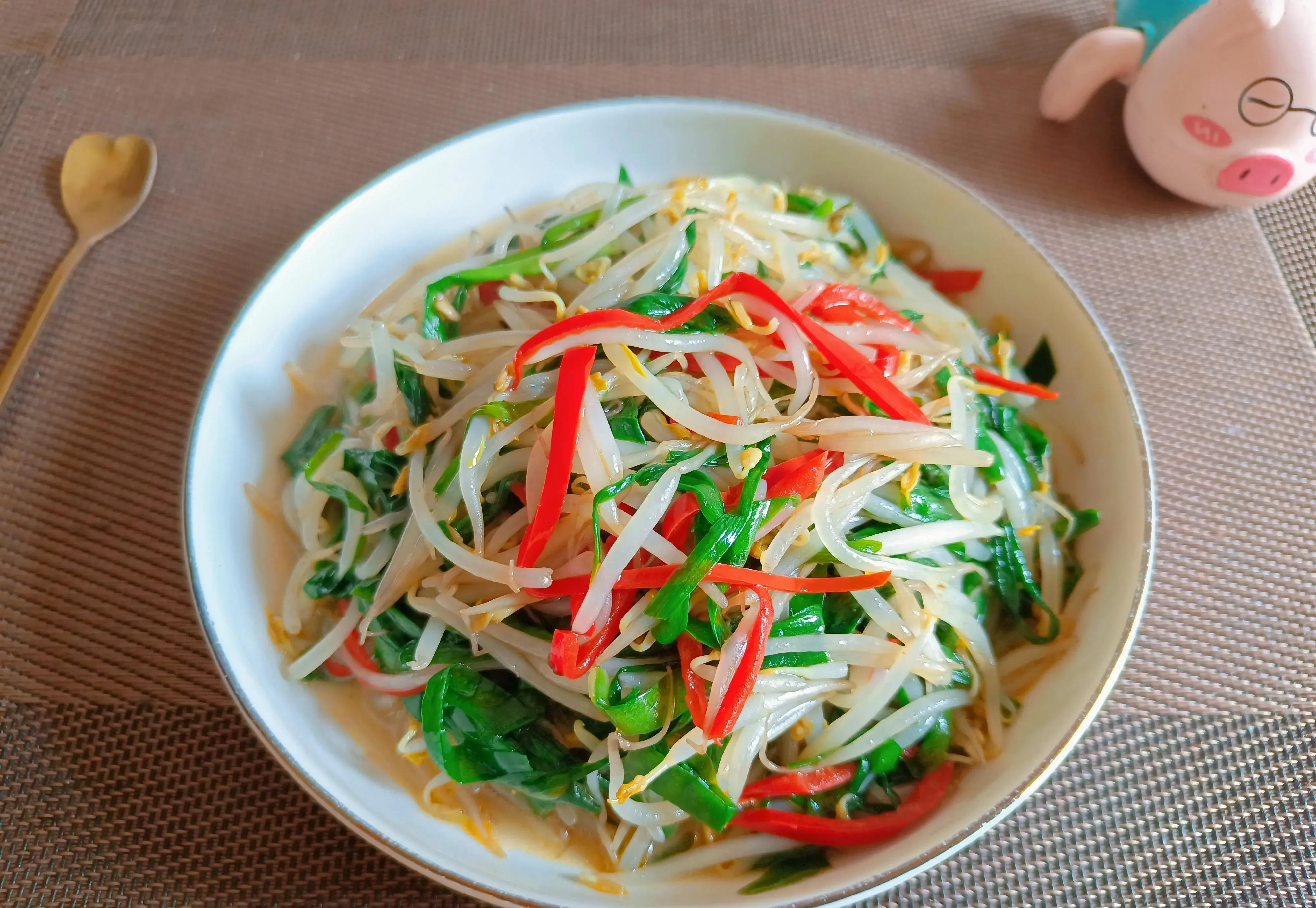 食材:韭菜80克、绿豆芽300克、彩椒1个、盐、食用油