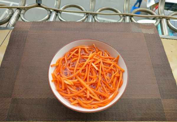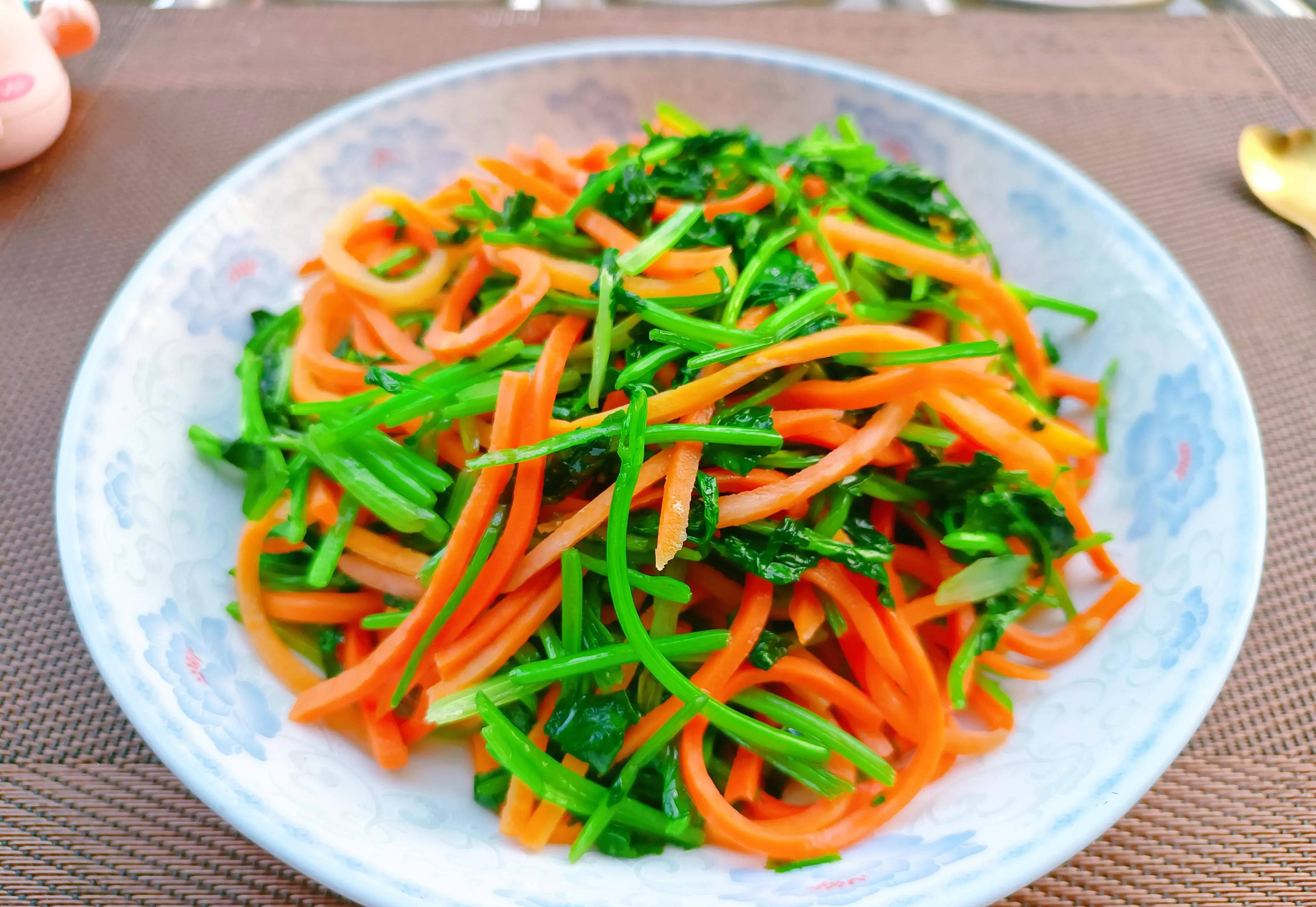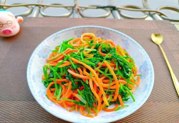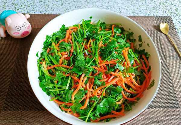 食材:香菜100克、胡萝卜丝80克、盐、蒜子、食用油、芝麻油