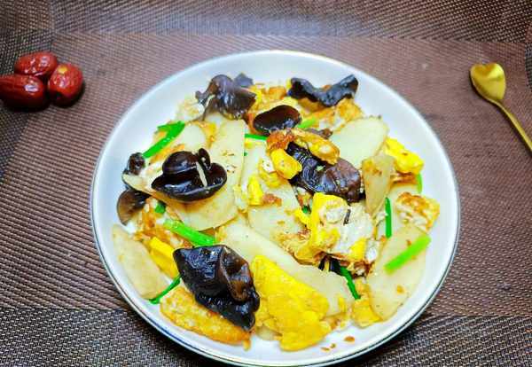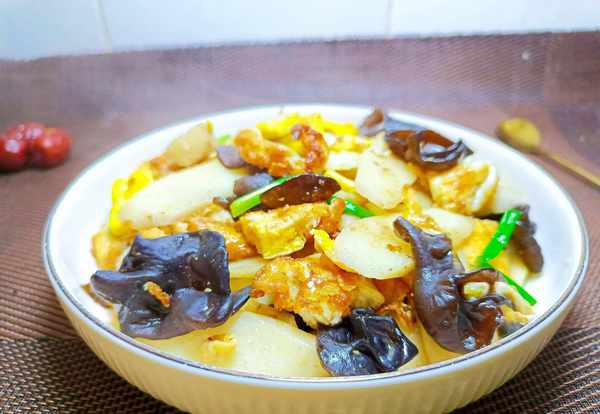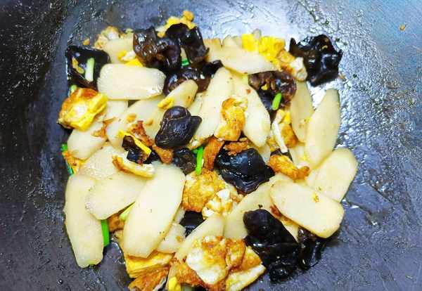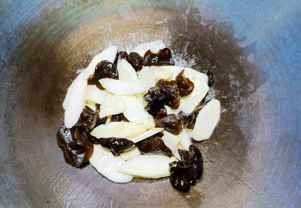 ②木耳提前用冷水泡发30分钟,加点面粉揉搓干净。锅中烧油,倒入木耳焯水。约1分钟后捞出木耳,沥干水分。去掉山药的皮,洗干净,再切成片。锅中烧油,倒入山药和木耳,开大火炒。