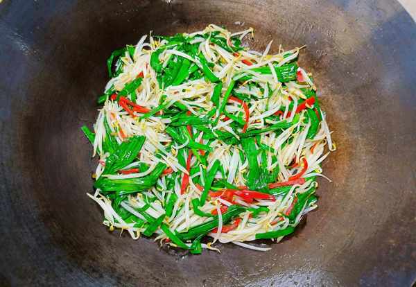 ②韭菜提前用水洗干净,切成小段。等绿豆芽颜色炒到透明的时候,倒入韭菜,开大火炒。