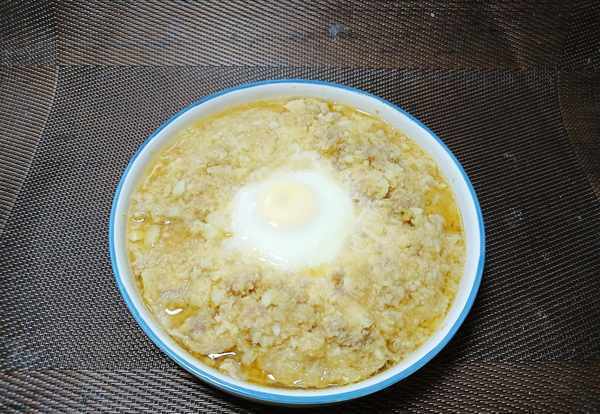 ②马蹄和肉末中加点生抽、葱姜水、盐、食用油,顺时针搅拌均匀,再放入盘中。把马蹄肉馅中间挖一个洞,打入1个鸡蛋进去。