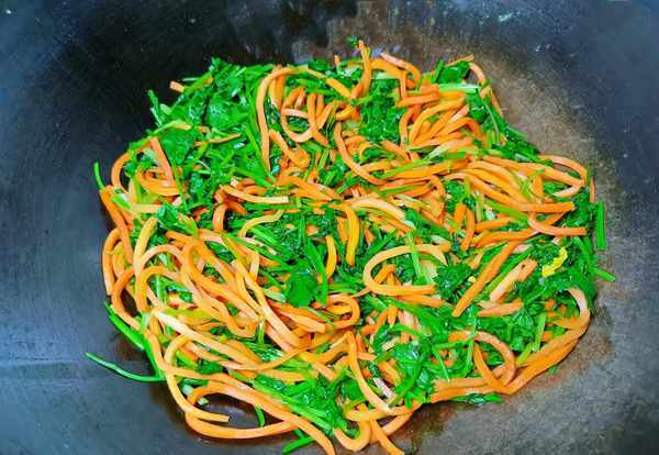 ③锅中烧热油,倒入蒜末爆香。把香菜和胡萝卜丝倒入锅中,开大火翻炒一会儿。