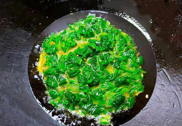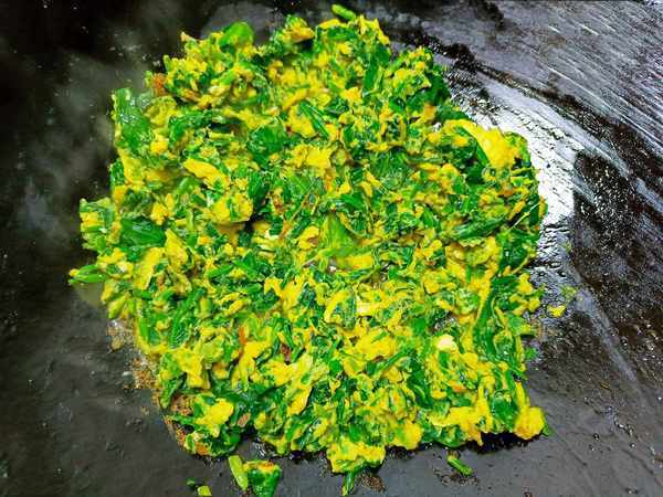②把鸡蛋打入碗中,加盐调味,搅拌均匀。锅中滑油,倒入菠菜鸡蛋液。等底部鸡蛋液凝固后,用铲子轻轻翻炒。
