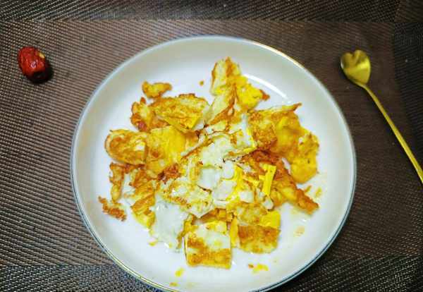 ①锅中滑油,打入鸡蛋煎。等鸡蛋全部金黄时盛起来,切成小块。