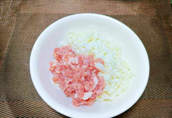 ①我们把里脊肉洗干净,剁成碎末放入碗中。削掉马蹄的皮,洗干净,剁成碎末,放入肉末中。