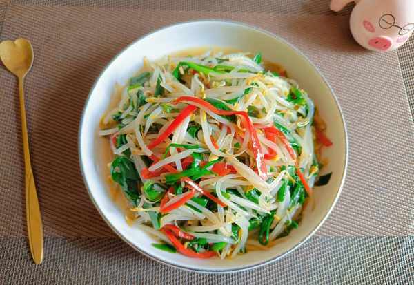 ①我们把绿豆芽泡入水中,多淘洗几次,去掉绿豆壳。再搓洗几下,捞出沥干水分。去掉辣椒的蒂部,洗干净后切成丝。锅中烧油,倒入辣椒和绿豆芽,开大火爆炒。
