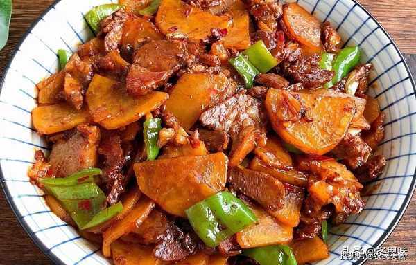 5、平底锅内倒入少许油,放入辣椒胡萝卜洋葱翻炒,倒入酱汁,加入肉段,快速翻炒均匀即可。