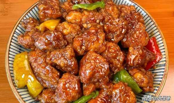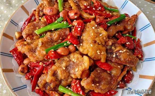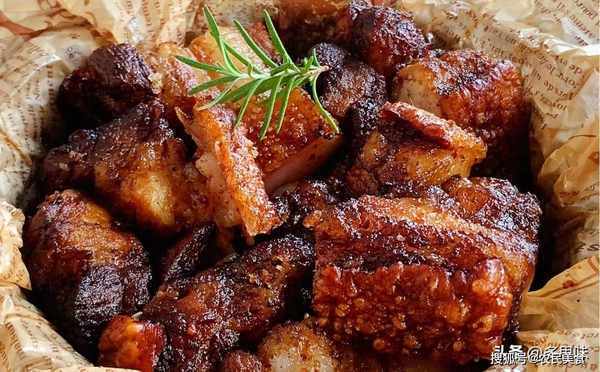 4、锅中油温6成热,放入肉段炸定型捞出,油温再次升高复炸至酥脆全熟即可
