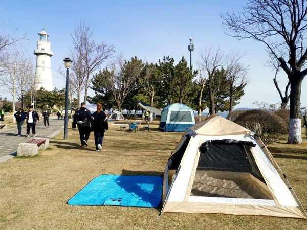 昨日上午,在悦海公园灯塔广场东侧的绿地上,大大小小的帐篷散落开来,春游的氛围感顿时扑面而来。在帐篷下小坐,抬头便是地标建筑灯塔,回头则是美不胜收的海景,这样的舒适惬意令人全身心放松。