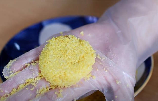 4.先裹一层清水,然后蘸一层面包糠,按成一个小圆饼的形状。