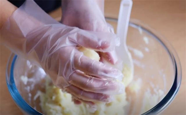 3.捣成泥之后我们加一勺食盐,再放一些黑胡椒粉调味,拌匀之后直接揪一小块当作剂子,在掌心稍微的团一下。