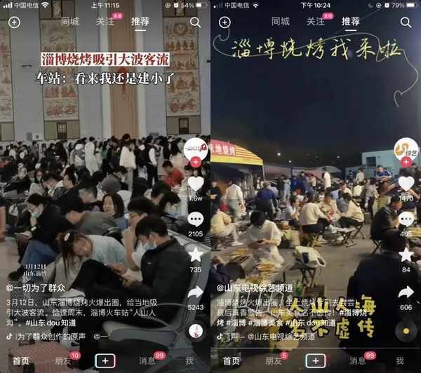 第三,抖音等短视频平台的深度发酵。今年三月前后,济南、泰安等周边城市的大学生组团坐高铁来到淄博撸串,淄博高铁站客运量空前高涨,各烧烤店一座难求,这一行动在社交平台上迅速“人传人”,从而造就了开春后第一个餐饮大IP。现在,不止淄博的烧烤店顾客爆满,就连周边城市,但凡带“淄博”字眼的烧烤,都分到了红利,客流量比平时多了好几倍。