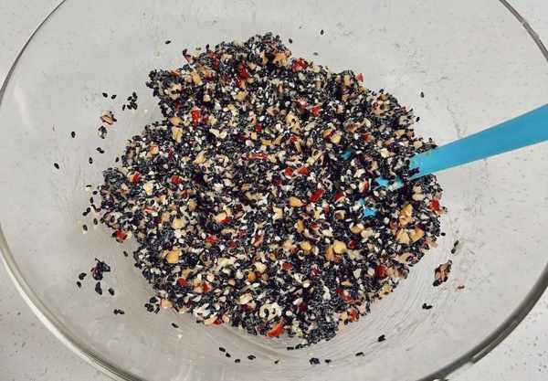 2. 将黑芝麻、白芝麻、红枣碎、核桃仁碎、低筋面粉倒入一个大碗中,加入鸡蛋清,搅拌均匀。