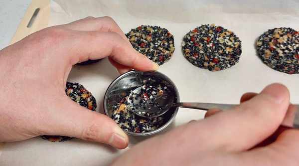 烤盘中铺一张油纸,舀一勺芝麻馅放在饺子切模里,用勺子按压成圆形的薄饼后,取出切模;芝麻饼尽量摊薄一点,这样烤的才会更脆,用时也会更短。