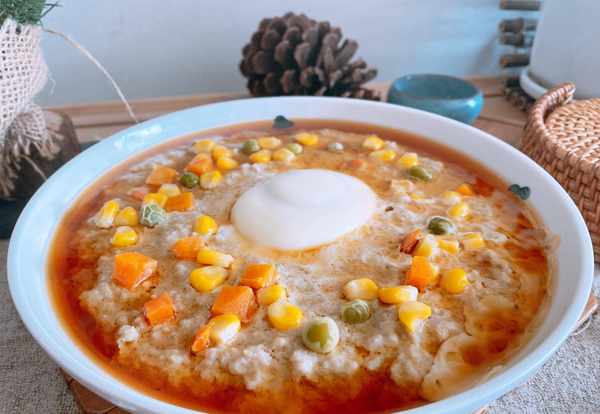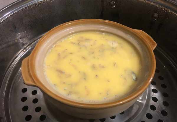 步骤4:接着装盘,撒些蔬菜粒,打入1个鸡蛋,再上锅蒸15分钟。