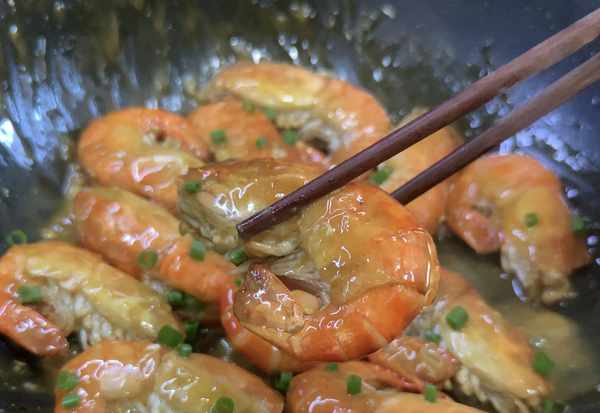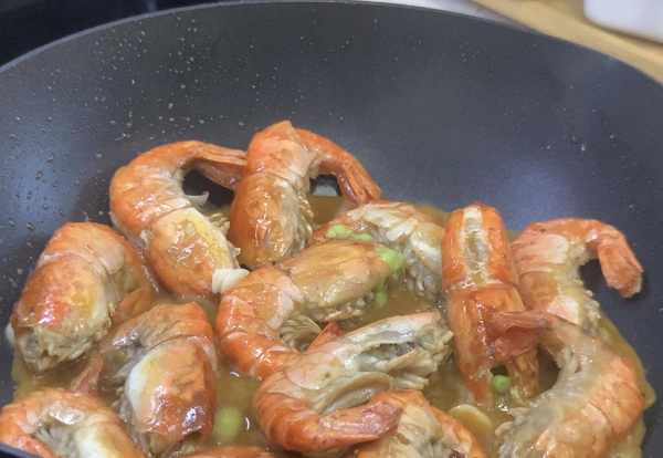 步骤3:起锅烧油,放入罗氏虾煸炒片刻,炒至虾面变色,再加葱姜煸香。