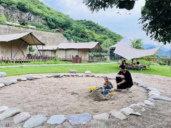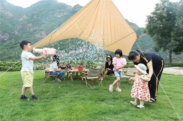 ↑游客带孩子在野三坡景区露营基地的娱乐区玩耍。新华社记者 高博 摄