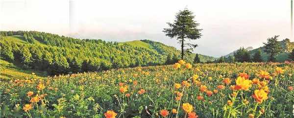 驼梁山顶坦荡如砥,绿草如茵,花海似锦,隐于蓝天白云和松林之间,再点缀上五颜六色的帐篷,就像散落的糖果,看着就心动。最值得称道的是遮天蔽日的原始森林,依山势高低而品种各异,组成了一幅巧夺天工、美不胜收、令人留连忘返的风景画。
