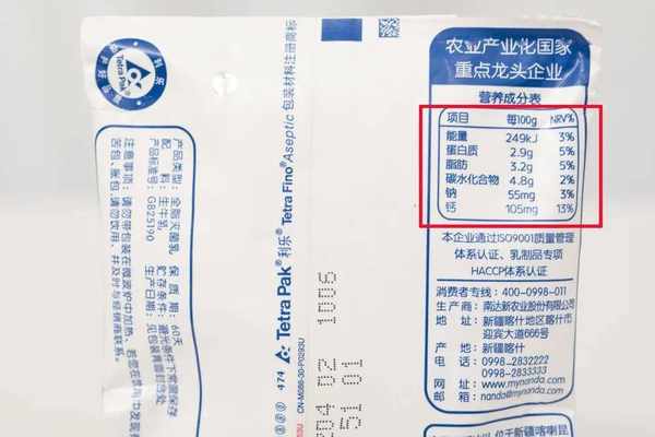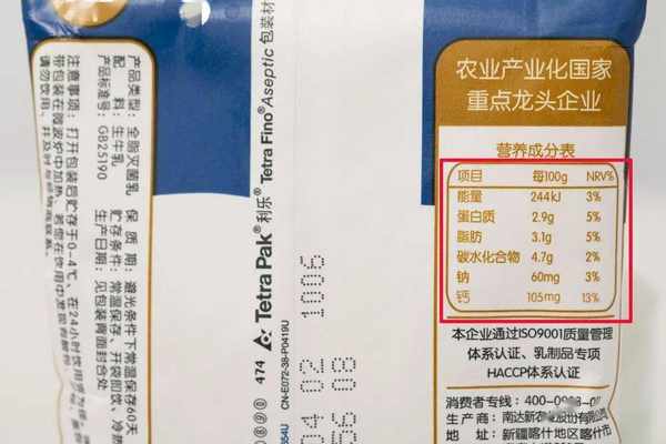 下图是南达纯牛奶的营养成分↓