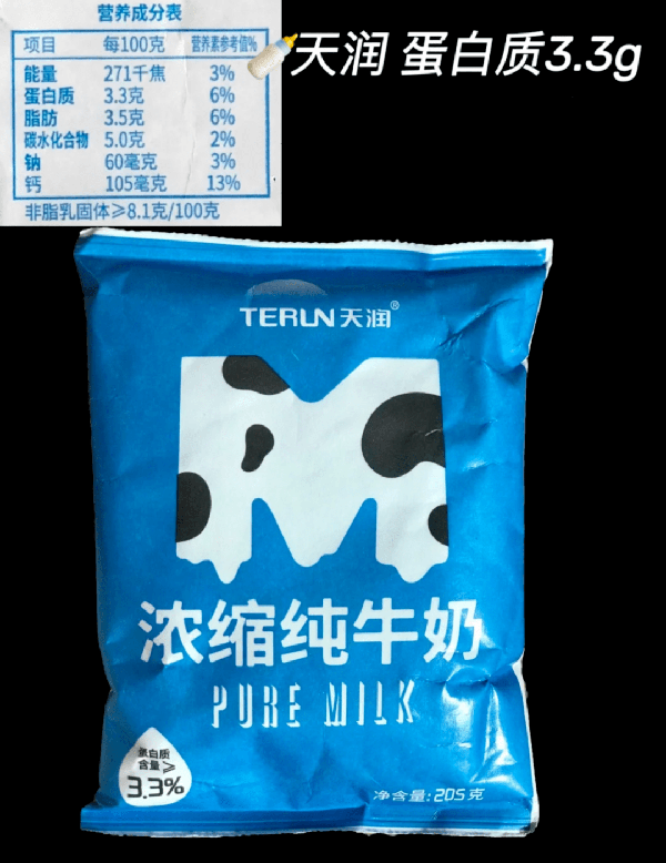 下图是西牧天山纯牛奶的营养成分↓