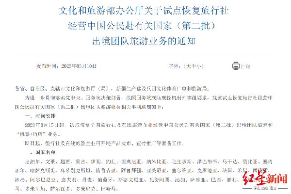 近日,文化和旅游部再发通知:3月15日起,试点恢复全国旅行社及在线旅游企业经营中国公民赴有关国家(第二批)出境团队旅游和“机票+酒店”业务。第二批名单共有40个国家,包括法国、意大利、西班牙、丹麦等热门欧洲国家。