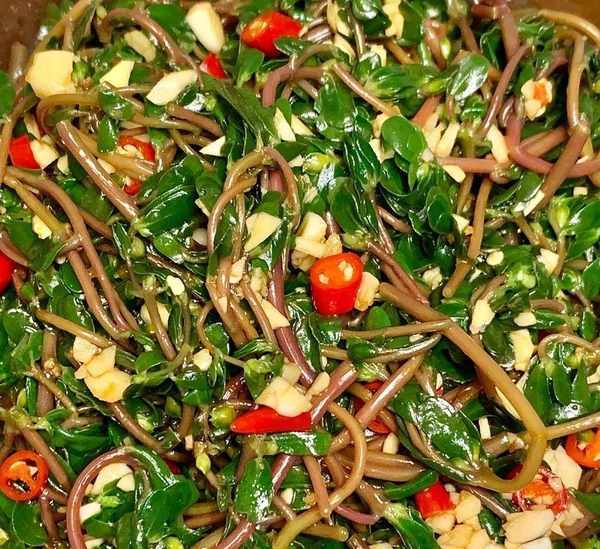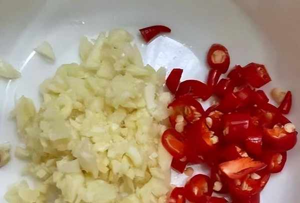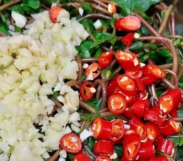 第一步,把马齿觅摘洗干净,嫩叶留下,其它全部扔掉。大蒜拍扁剁成末,小米辣切成丁。