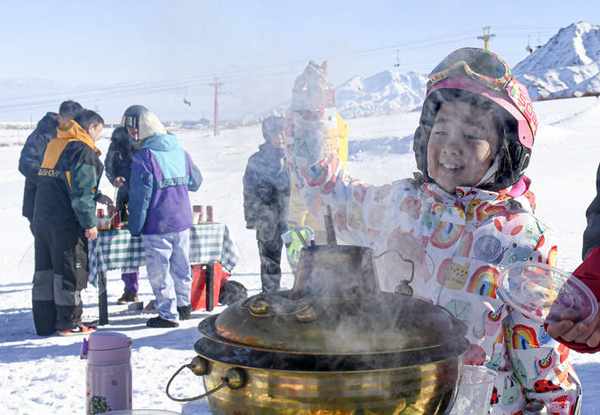 新疆白云国际滑雪场,小朋友在雪场举办的冰雪火锅节上等待品尝美食 新华社图