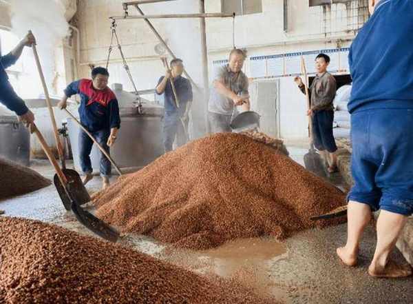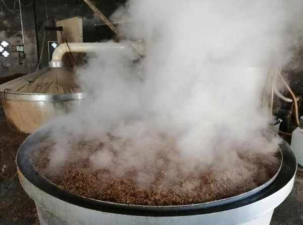 在一整年的酿造过程中,它的酿造原料会经过一共9次的蒸煮,只是在前两次的蒸煮过程在投料中是不会取酒的,是从第三次蒸煮开始,每次都会取酒,要把粮食中的酒取干净成为酒糟。
