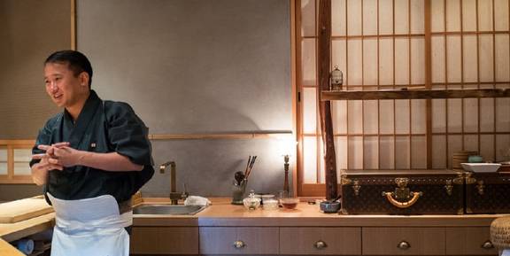 行天师傅自小与寿司结缘,祖父是位寿司职人,之后在纽西兰生活过,所以说得一口流利英语。曾经习练于东京的三星“あら輝”(Araki),传承了荒木水都弘的手艺,师傅搬家去伦敦后便自立门户,5年后摘下三星,堪称传奇。