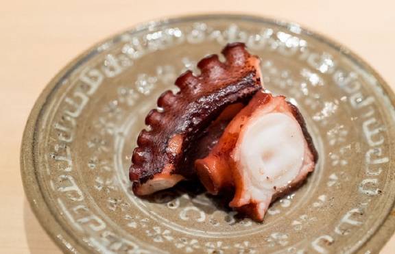现今几乎所有寿司店都上酒肴,对我来说,最好可免则免,没有什么原因,个人喜好罢了。篱凤螺(Pinpingai)、毛豆、河豚搭芽葱(Menegi)、乌鱼子配柚子皮及酱油、糠漬鮟鱇鱼肝、初海苔夹乌鱼子、赤海胆-海蕴-莼菜、银杏、煮章鱼,以及烤味噌熟成扇贝——要吃10道酒肴才入正题,本以为要等到海枯石烂才到高潮,没想到食材上乘、制作严谨,反而成为今日最佳。