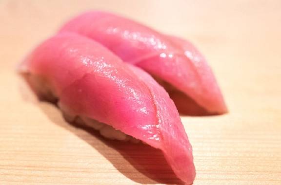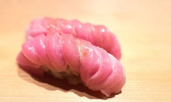 寿司有20贯,行天师傅以“本手返”捏制,虽然节奏流畅,可是少了点老师傅的干净利落。两种不同风味的鲔鱼作序幕,上完两贯蛇腹,再上两贯中腹,鱼脂跟风味重酸的赤醋饭,达到互相平衡,化为鲜甜。