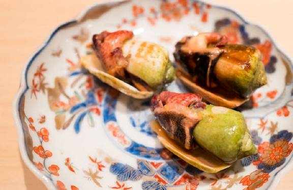之后4贯寿司,分别是拟鲹鱼(Shima-aji)、梭子鱼(Kimasu)、石荫贝(Ishikagegai),还有星鳗;中间夹着热食,有烤喉黑佐醋饭、煮鲭鱼、烧柳叶鱼碎饭及煮鲍鱼配鲍肝汁。