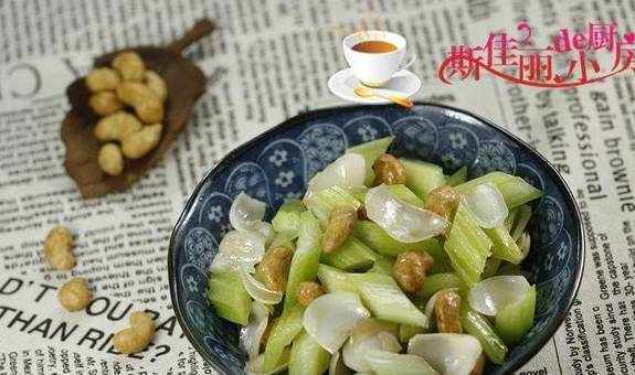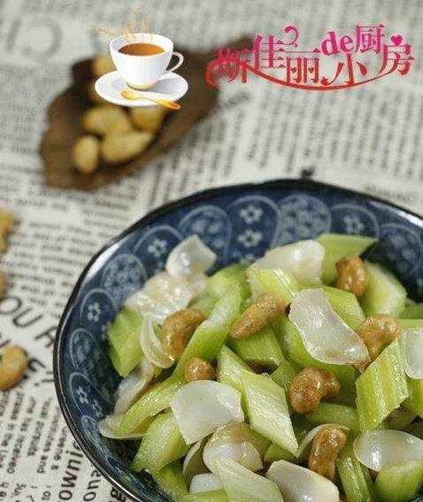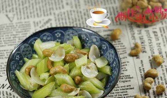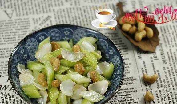 西芹腰果炒百合。西芹是一种百姓餐桌上的常见的蔬菜,它质地脆嫩,芳香气味,常吃能平肝降压、镇静安神、利尿消肿、防癌抗癌、养血补虚等功效;百合细腻软糯,洁白如玉,甘甜清香,风味别致,具有润肺止咳、美容养颜、宁心安神、防癌抗癌等功效。