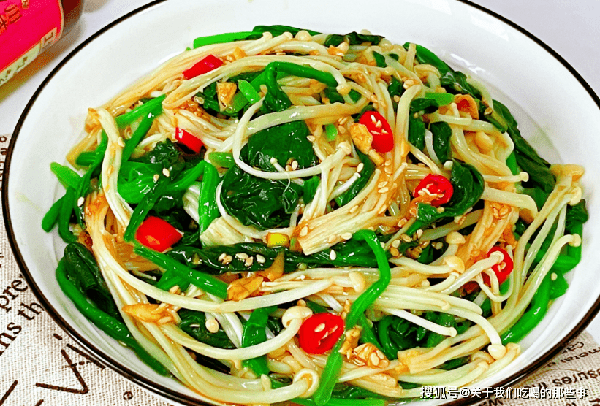 菠菜、金针菇放入盆中,加入食盐、生抽、香醋、蚝油、白糖、鸡精,把小米椒、熟白芝麻放在最上面,用热油泼一下炝出香味,翻拌均匀后即可使用,清脆爽口,好吃到停不下来!