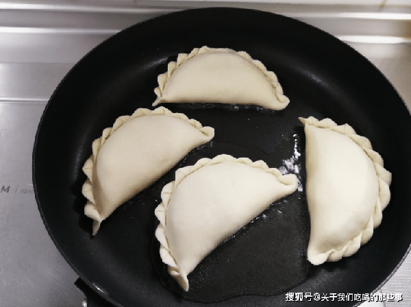 用菜盒子皮包一勺韭菜鸡蛋馅,对折后捏成韭菜盒子。平底锅倒油烧热,放入韭菜盒子,小火煎至两面金黄即可出锅。