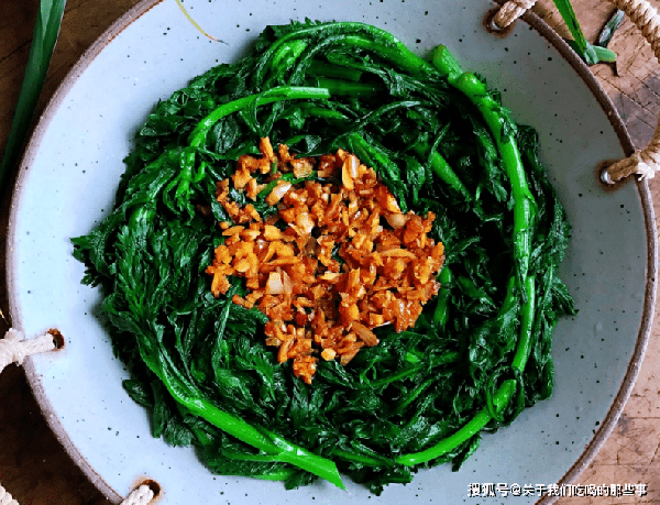 起锅烧油,放入蒜末爆香,炸至颜色金黄后倒入碗里的料汁,小火煮至浓稠后关火,把蒜蓉酱汁浇在茼蒿上即可。煮好的料汁直接淋在盘中茼蒿上面,做法简单又好吃的茼蒿美食制作完成。