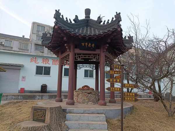 酒厂院内矗立着一块石碑,正面有末代皇帝傅仪手足傅杰的题词“凤城老窖”,看后面的碑文得知,石碑立于建厂一百五十周年。再往前走,看到一口百年古井,井的上方,修建一座八角亭。看到旁边的记载,这口井时为菜民用水,后成为凤城老窖酿酒水源。凤城老窖酒厂最早期酿酒,就是用这口古井水,可惜现在不能用了,现在用的凤凰山山泉水。
