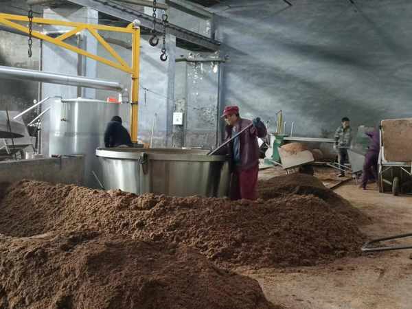 凤城老窖,纯粮酿造。这是烧酒坊外墙的八个大字。我只认识烧酒的几个大锅,其它的设备不认识,锅盖上面有吊车的架子,要想拿起锅盖是需要吊车吊的。我注意到地面上堆着的原料,用手捧起,看了看,闻了闻。因工人已下班,没有看到烧酒的场景。我第二天早晨特地跑来,在机器轰鸣声中,蒸汽雾腾中,工人忙碌中,拍了一小段视频。