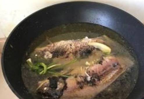 煎好之后倒入开水,超过鱼身2厘米左右的水,用大火熬,放入葱结,倒入少量料酒,大火炖煮15分钟。