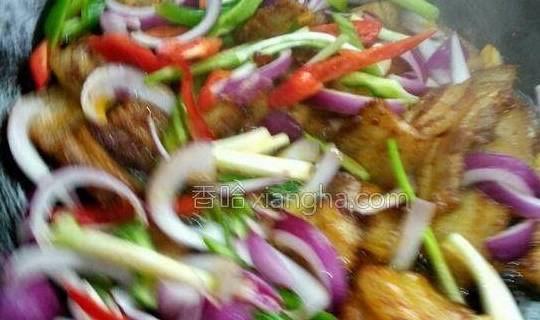 配料:五花肉400克、青红辣椒各一个、洋葱半个、葱段适量、姜3片、蒜头3瓣、八角2粒、豆瓣酱1汤匙、白糖半小勺、生抽1汤匙、老抽适量、盐适量、鸡精少许、白酒1汤匙