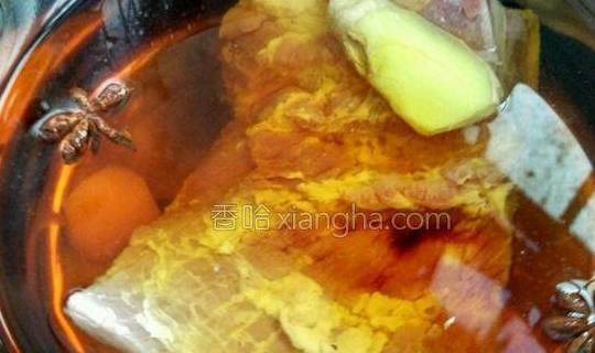 3.五花肉冷水入锅,加入姜片、八角、老抽、白酒煮至八成熟,捞出过一回冷水