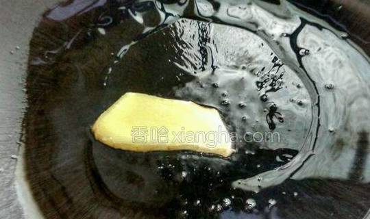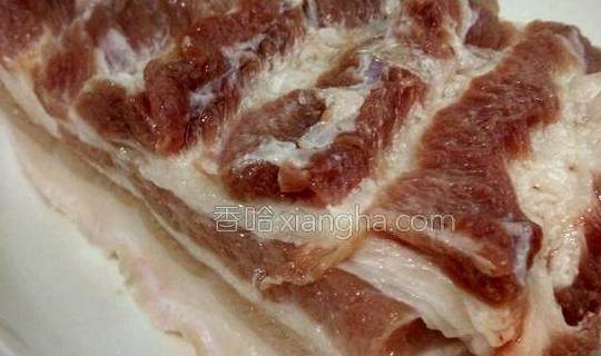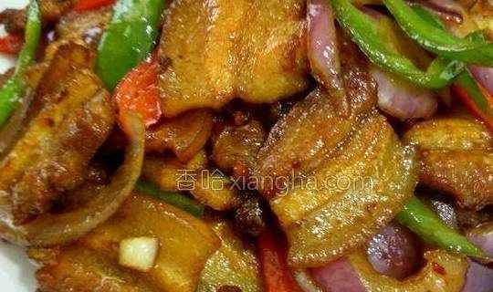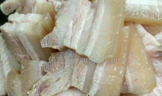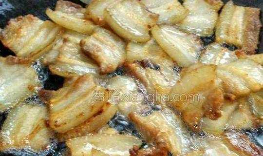 6.加入五花肉慢火煸炒,直至肉片打卷变得焦黄色为止