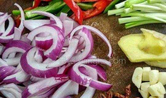 2.洋葱青红椒各切丝,葱切段,姜切片,蒜头切碎,八角洗干净等备用