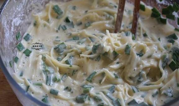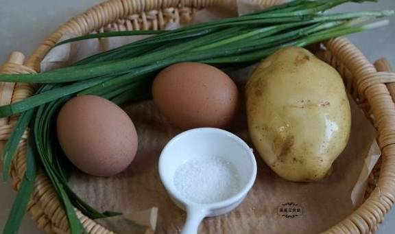 【食材】新鲜土豆一个,韭菜一把,鸡蛋两个,盐半茶匙,水适量。