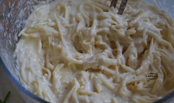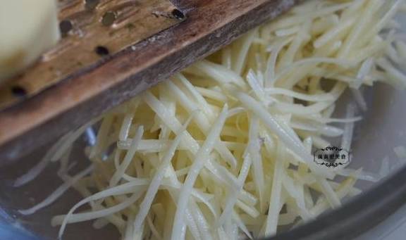 2、土豆去皮,用擦丝器擦成细丝。