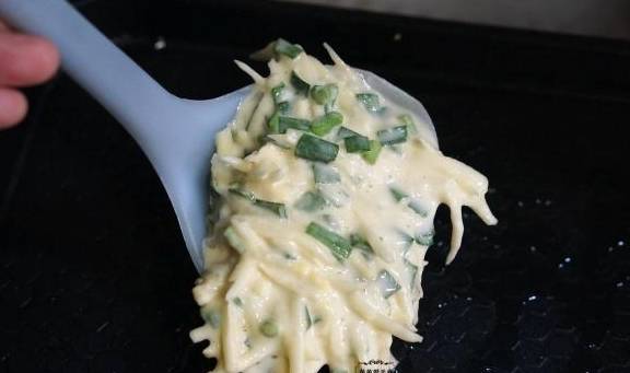 7、再倒入少许的水,搅拌均匀,记得面糊不要太厚,太厚的面糊烙来的饼比较硬。