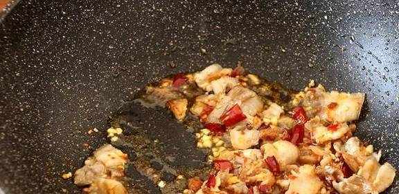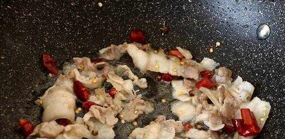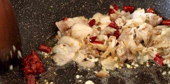 加一点料酒去去腥味,炒至肉片变色,出油后推到一边,加蒜末、辣椒段、花椒和郫县豆瓣酱,炒出红油后把肉拉回来炒匀。
