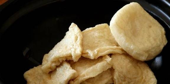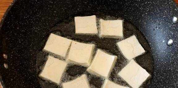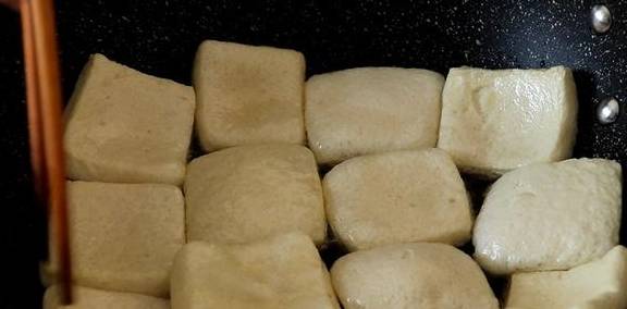 锅内倒油,下千页豆腐煎,煎到千页豆腐膨胀变大,取出备用。(千页豆腐在锅内膨胀这个是正常的,是不会炸的,不用担心,取出来后,它会慢慢缩回去。)