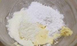 黄油切小块,隔温水软化至手指可以戳动,先用电动打蛋器搅拌一下,再加入细砂糖和奶粉